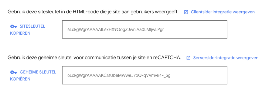 Kopieer en plak beide sleutels in een mail en stuur deze aan mij. Hiermee kan ik je formulier beveiligen tegen spam.