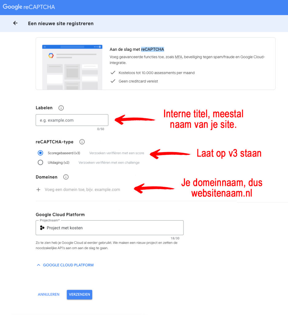 Als eerste ga je naar: https://www.google.com/recaptcha/admin/create